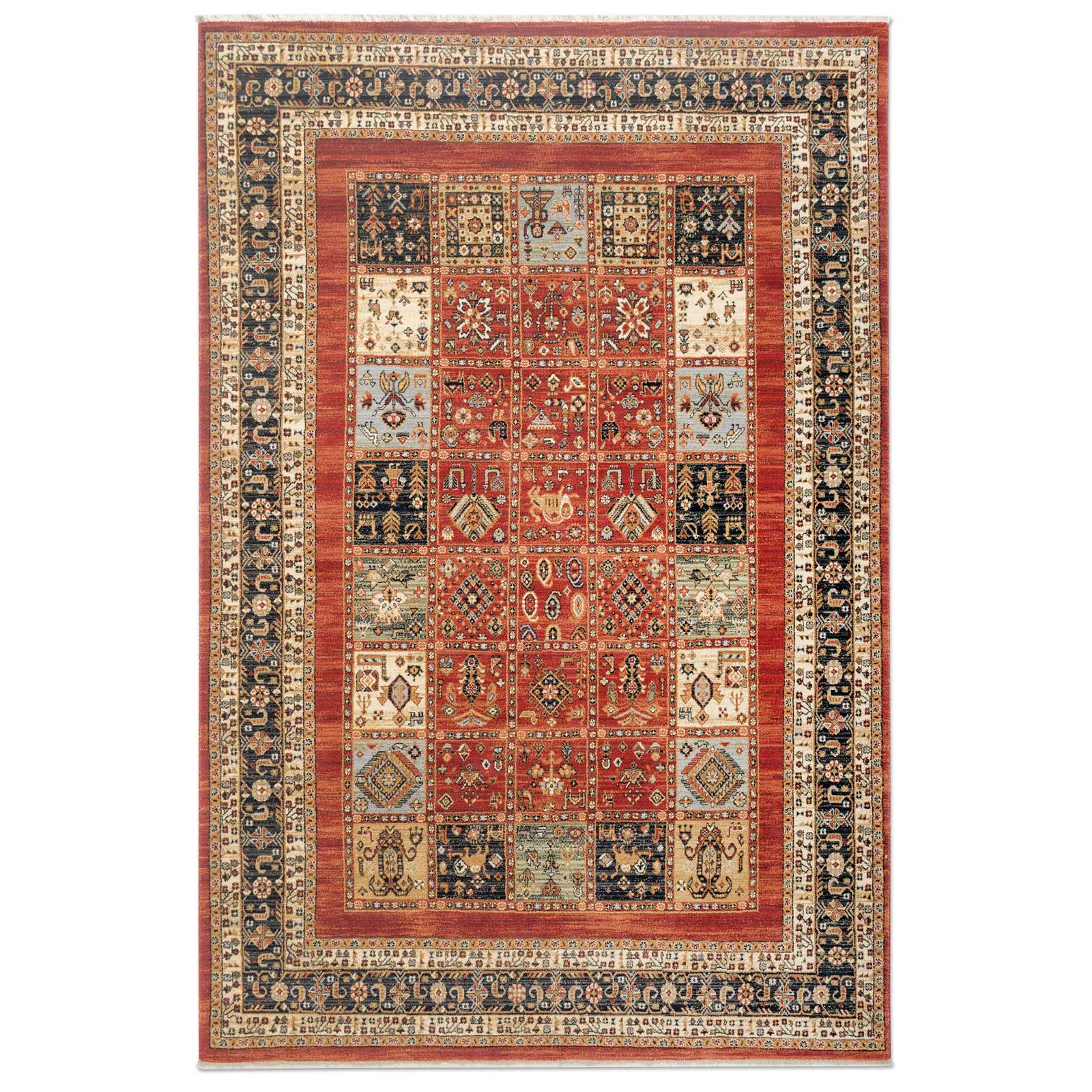 Farvepaletten kombinerer varme, dybe nuancer af rød, terracotta og guld, indrammet af en detaljeret bort. Tæppet er bevidst designet med et semi-antikt look, der giver det en sjæl og patina, som normalt kun ses i ældre, håndknyttede tekstiler. Det fungerer både som et markant "statement piece" i den enkle bolig og som en harmonisk forlængelse af den klassiske indretning.