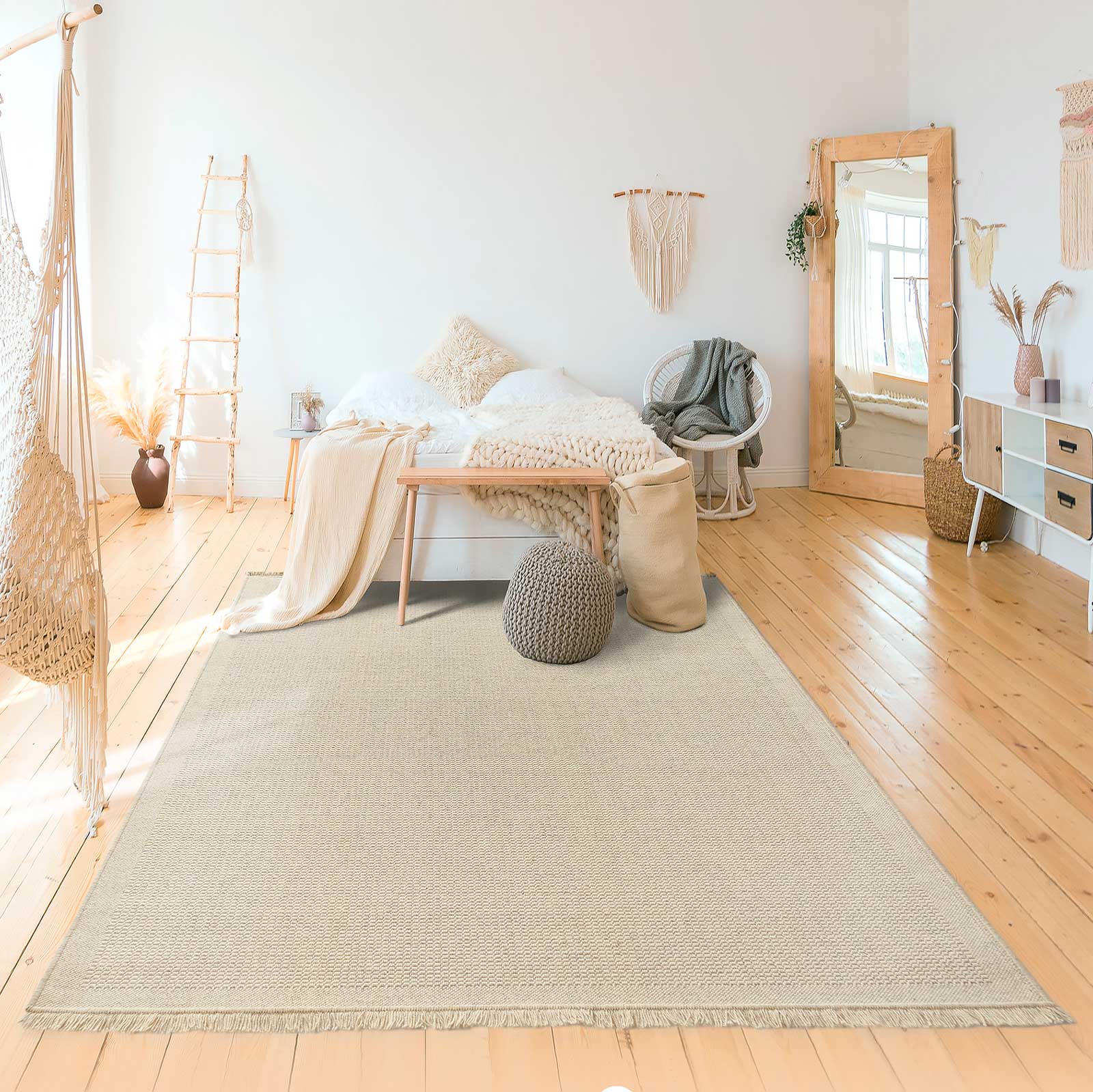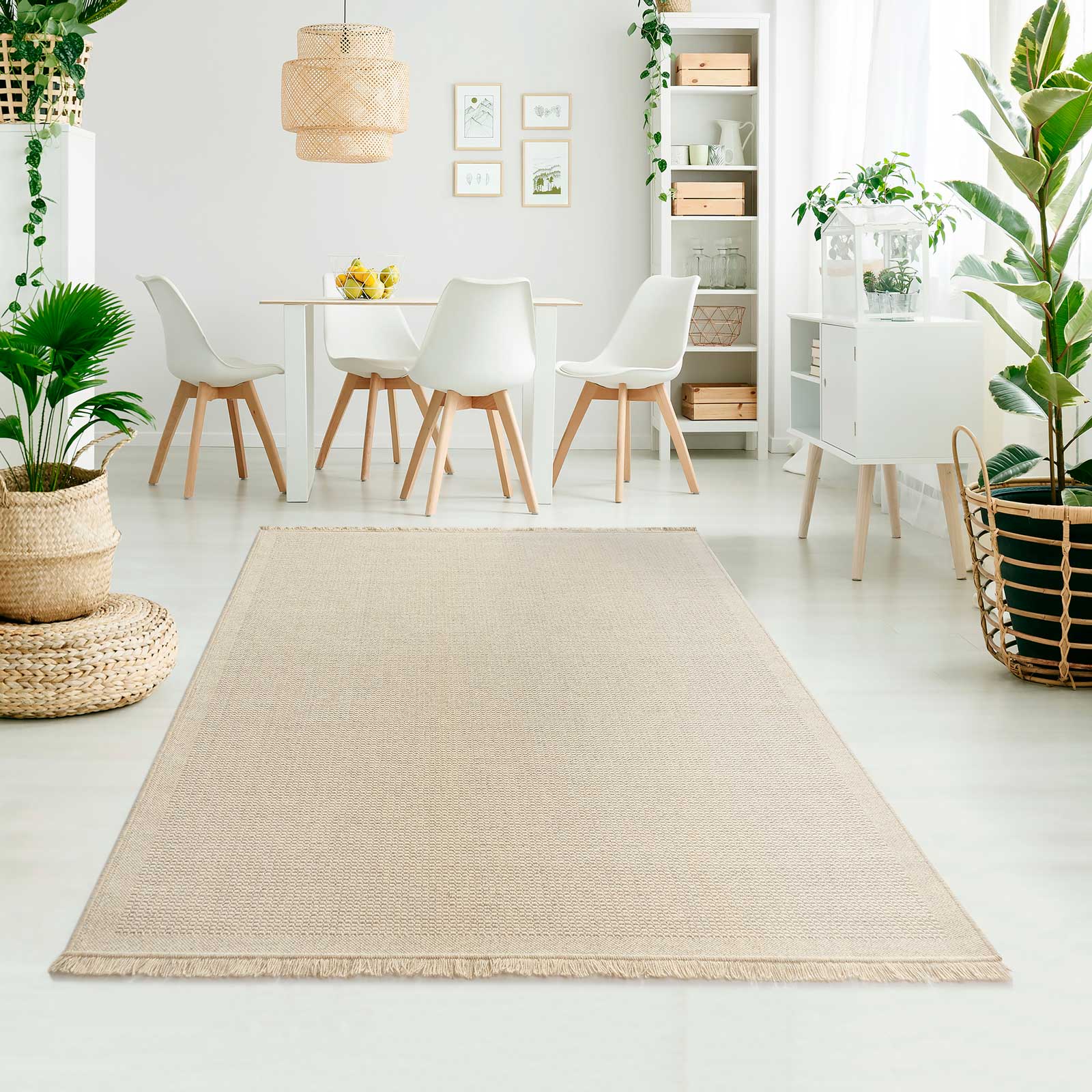 Farven lys beige er en tidløs klassiker, der reflekterer lyset smukt og får rummet til at virke større. Det monokrome design gør det nemt at matche tæppet med forskellige møbler og stilarter – fra det minimalistiske til det mere boheme-inspirerede hjem.