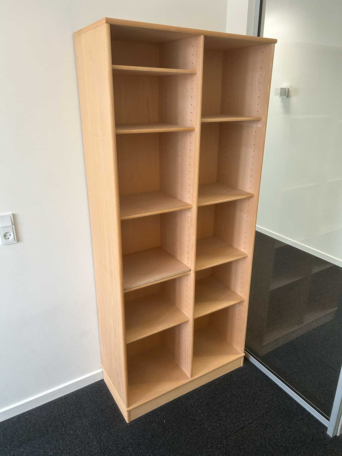 Høj reol i lyst træ. Perfekte til kontoret eller hjemmearbejdspladsen.